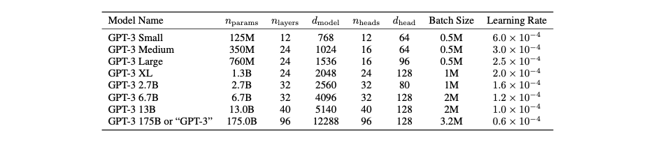 GPT-3는 GPT-2와 동일한 모델과 아키텍처를 사용한다. 모델 사이즈에 따른 성능 평가를 위해 GPT-3를 포함한 8개의 모델이 개발된다. 모델의 개별 사양은 다음 그림과 같다. 는 학습 파라미터의 개수, 은 layer의 개수, 은 개별 bottleneck layer에서 unit의 개수, 는개별 attention head의 차원을 의미한다. 모든 모델은 문맥 window()가 2048개의 토큰이다. 아래 그림의 마지막에 있는 175B의 파라미터를 가진 모델이 GPT-3다.