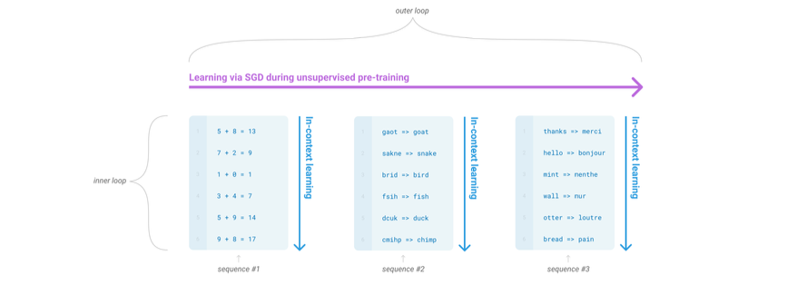 위의 그림에서 메타학습은 outer loop와 inner loop의 구조를 감지할 수 있는 능력이다. 비지도학습을 통해 가중치를 업데이트하는 전체의 과정이 outer loop라고 한다면, 유사한 패턴을 가진 시퀀스들의 모음이 inner loop가 된다. 여기서 문맥 내 학습은 메타학습의 inner loop를 지칭한다. 즉, 문맥 내 학습이 개별 태스크에 대한 사양이라는 것은 단일 시퀀스 내에서 반복적으로 포함되는 하위 태스크(sub-task)가 존재한다는 것이다. 여기서 추후 나올 개념인 Few-shot, One-shot, Zero-shot은 메타학습을 통해 언어모델이 inner loop를 감지하는 과정에서 하위태스크와 관련된 예시를 어느 정도 제공할 것인지에 대한 개념이다.