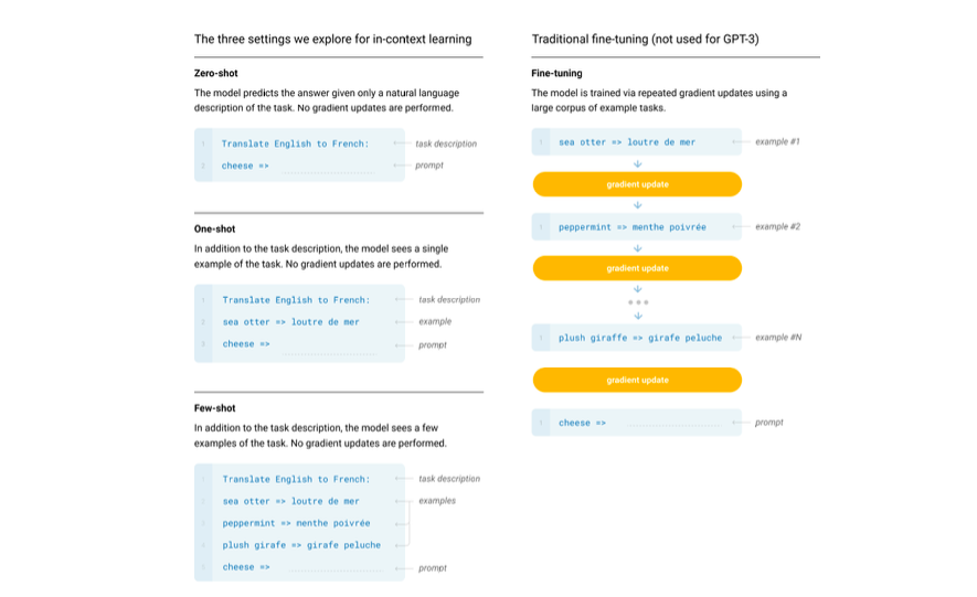 구체적으로 Fine-tuning과 few-shot, one-shot, zero-shot을 설명한 내용은 위의 그림과 같다.