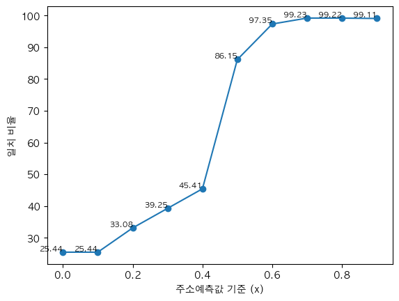 토큰을 기준으로 JaroWrinkler의 유사성을 계산한 결과는 다음 그림과 같다. 가장 높은 일치율을 보이는 x는 0.6으로, 99.12%라는 일치율을 보인다.